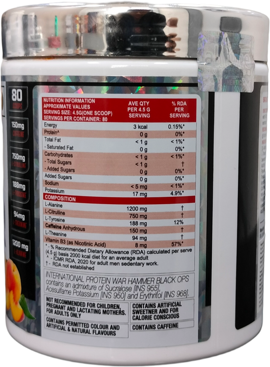 INTERNATIONAL PROTEIN BLACK OPS WAR HAMMER PEACH ORANGE 360G | Pumps & Performance | 80 Servings | Product Expiry - 25/09/25
